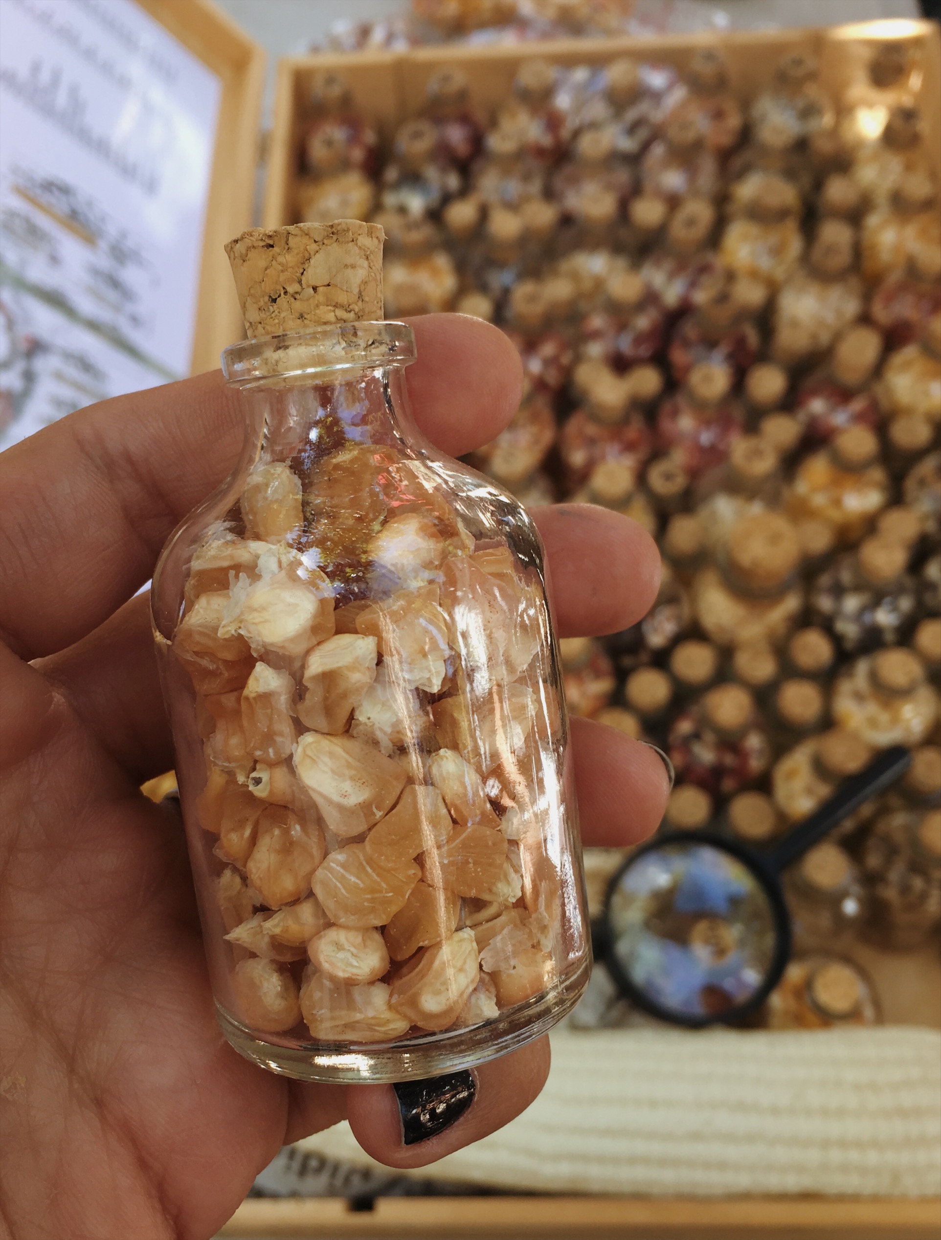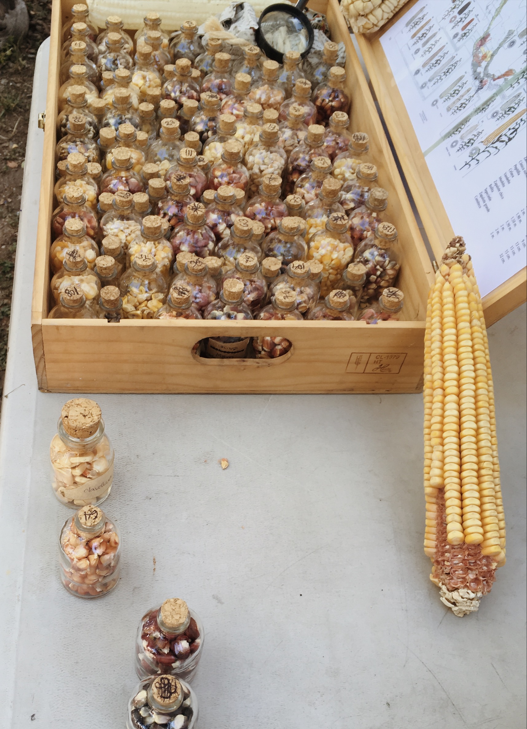 We began the workshop with an introduction of the history of tortillas and their base of maíz. El Paye explained that Mesoamericans were the first to domesticate and harvest corn over 8,000 years ago. Today, there are 59 razas (types) of native corn in Mexico that are recognized by the Comisión de Biodiversidad. He passed around beautiful little vials of the different types of corn.