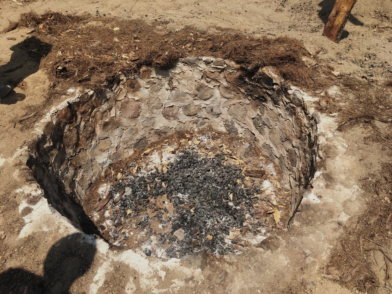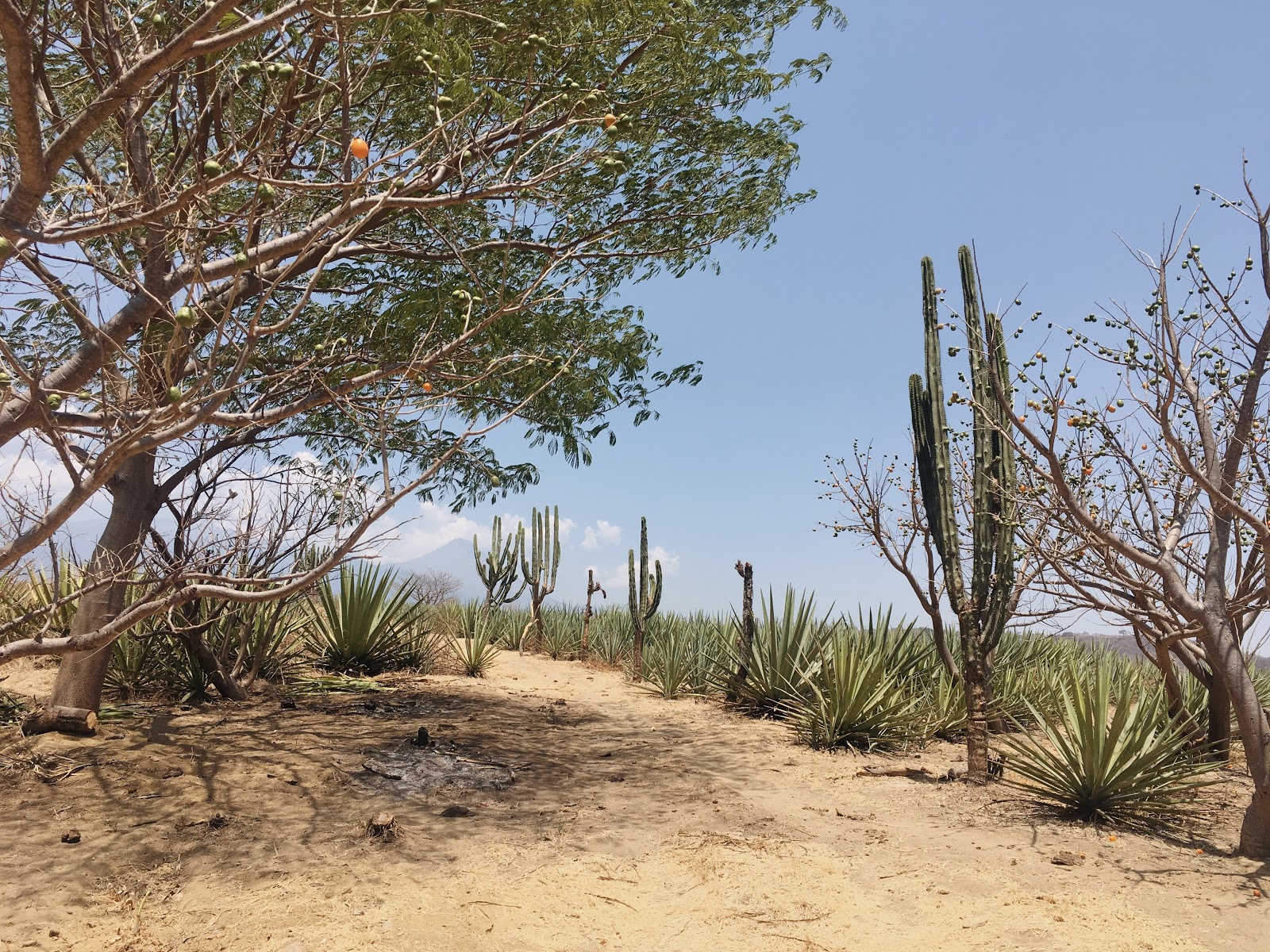 After a quick visit of an ancestral rock important to Don Chayo’s family, we arrived at Don Chayo’s taberna (tavern), where he makes the mezcal. His taberna sits on top of a vast, windy canyon, or barranca. Then, Pedro led the tour to the agave fields that surround the taberna. He explained how the local ecosystem of nopal cactus, ciruela trees, and the pollinating bats help the agave grow, which improves the mezcal’s quality.